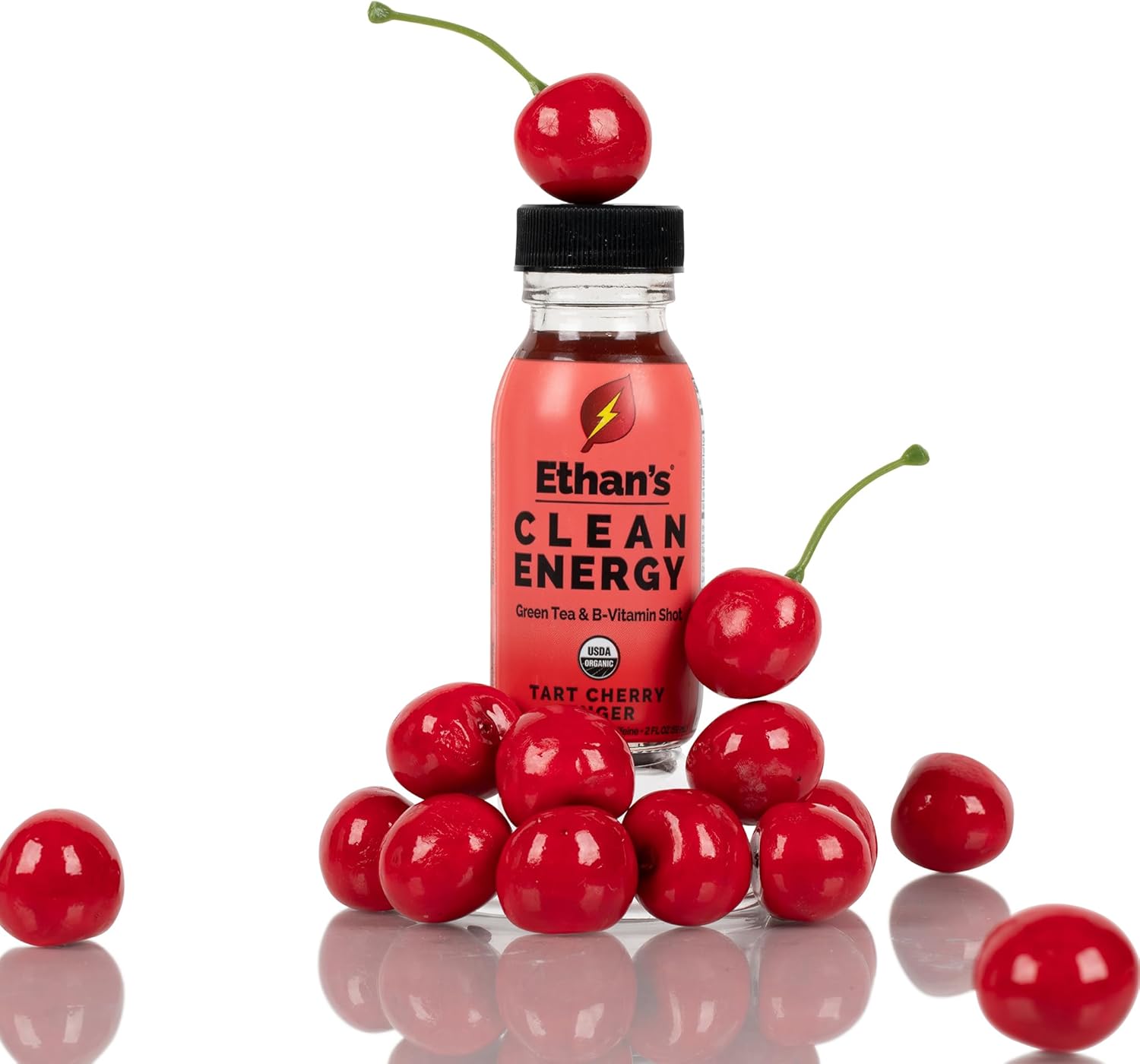 Ethan’s Organic Clean Energy Shots Tart Cherry Ginger, Sugar Free Natural Pre-Workout Focus Boost, Gluten Free, Vegan, B6 & B12 Vitamin C with Green Tea Extract and Guayusa (12 Pack of 2oz Shots)